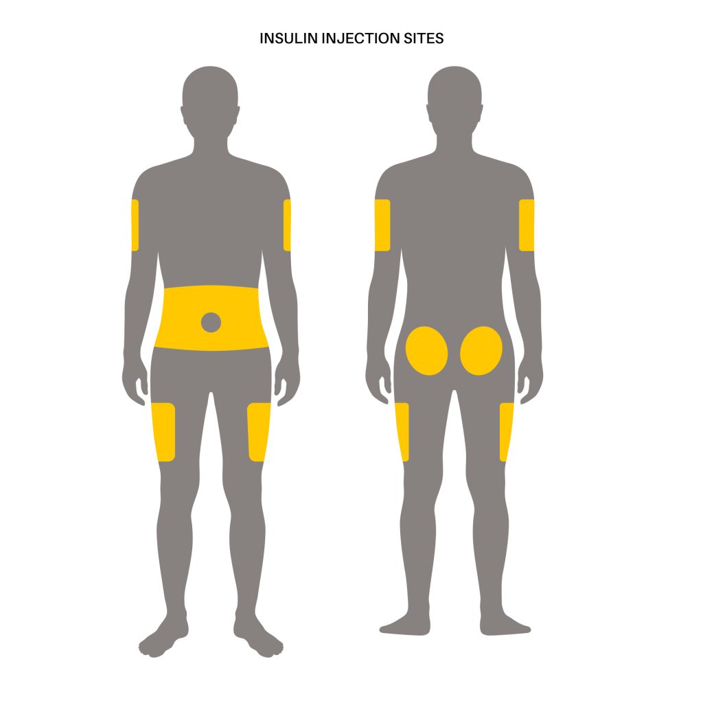 Na szybkość działania insuliny ma również wpływ miejsce jej podania. Możliwe miejsca podania insuliny przedstawiono poniżej. Insulina najszybciej wchłania się z okolicy brzucha, wolniej z ramion i ud, a najwolniej z okolic bioder i pośladków[7].