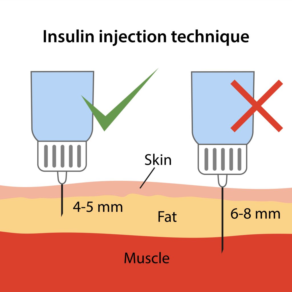 Grubość skóry człowieka może być różna i wzrastać z wiekiem, jednak rzadko przekracza wartość 3 mm, nawet u osób otyłych. W związku z tym uważa się, że zastosowanie u dorosłych igieł o długości 4 mm do podskórnego podania insuliny jest wystarczająca. Zastosowanie igieł o długości poniżej 6 mm znacznie redukuje możliwość podania insuliny domięśniowo. W przypadku igieł o długości 5 mm ryzyko podania domięśniowego wynosi < 2%, a dla igieł 6 i 8 mm odpowiednio 5 i 15%[5]. Obecne zalecenia Polskiego Towarzystwa Diabetologicznego z 2021 roku podają również, by do insulinoterapii u dorosłych stosowaćigły o długości ≤ 6 mm[1]. Porównanie podania insuliny igłami o różnej długości przedstawiono na rysunku poniżej.