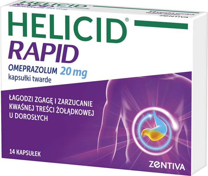 Helicid Rapid to jedyny lek zawierający inhibitor pompy protonowej o natychmiastowym uwalnianiu, wskazany w leczeniu objawów refluksu. Zawiera niepowlekany omeprazol, który szybko się wchłania, a dzięki zawartości wodorowęglanu sodu nie rozkłada się w żołądku i nie musi być podany jako kapsułka dojelitowa. Umożliwia uzyskanie ulgi w ciągu kilku minut, przy jednoczesnym utrzymaniu efektu terapeutycznego przez 24 godziny.[1,2]