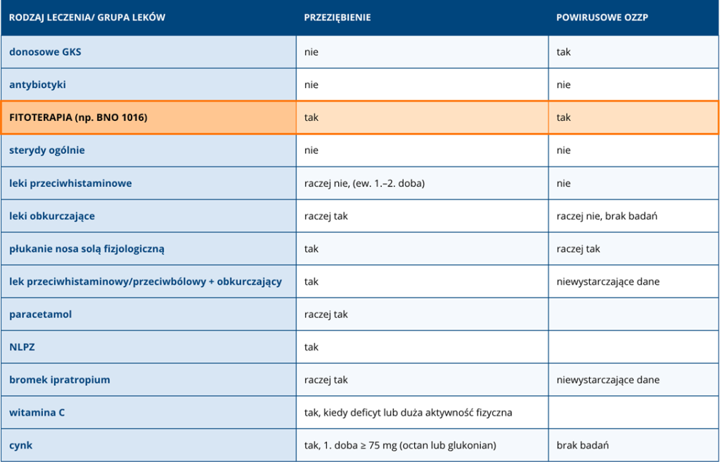 Pierwsze dwa fenotypy (przeziębienie/ostre wirusowe zapalenie zatok przynosowychi ostre powirusowe zapalenie zatok przynosowych) nie wymagają zawsze konsultacji lekarskiej. Rekomendowane preparaty dla tych przypadków omówiono w tabeli poniżej.